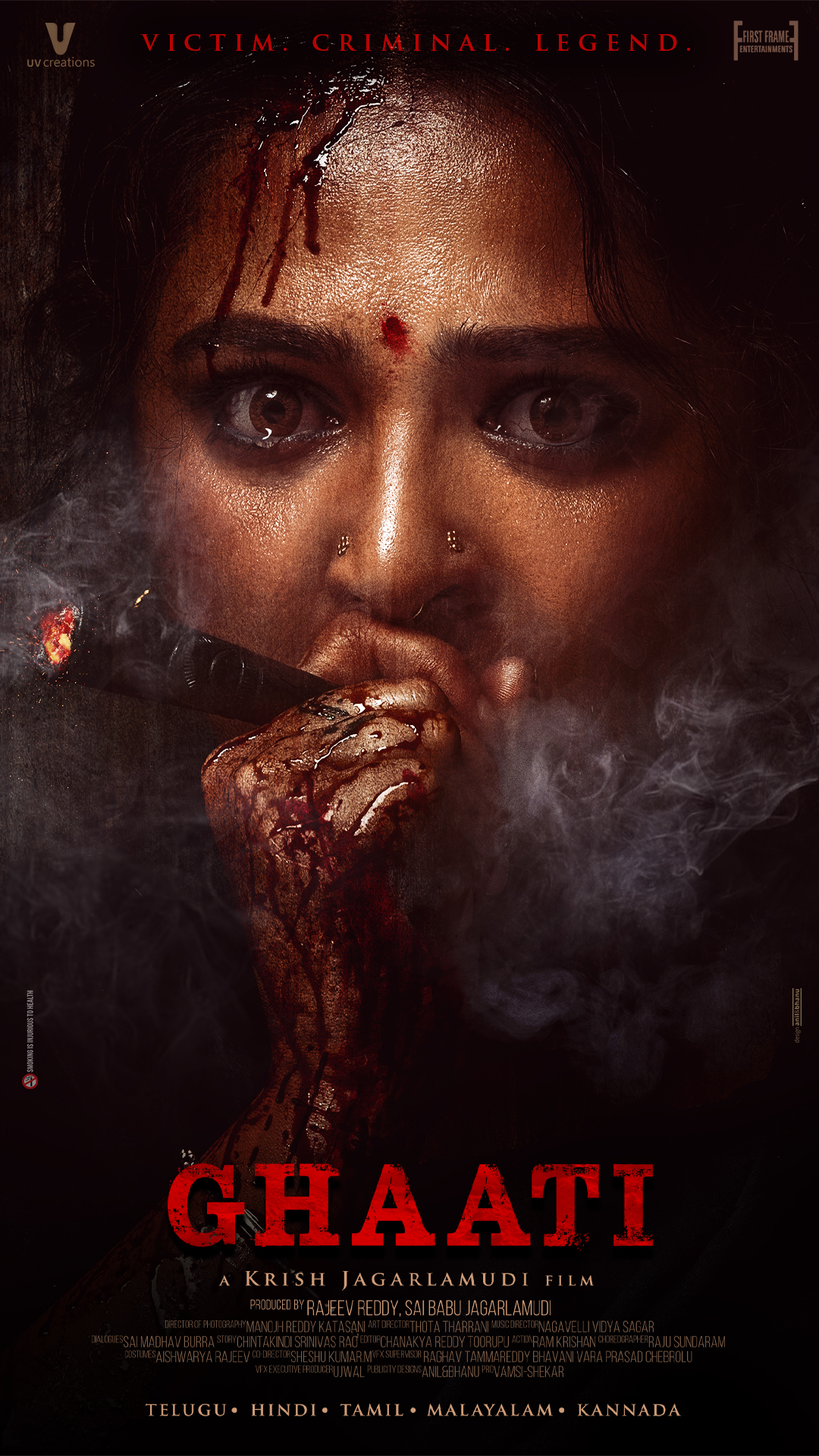 To celebrate Anushka’s birthday, the makers unveiled the first look poster, which reveals a stunningly fierce and ruthless avatar of the actress. In the poster, Anushka is seen with blood dripping from her head and hands, while a serious expression complements her bold look, complete with a bindi on her forehead and smoking a Banga. Her teary eyes and the two nose rings further amplify the intensity of her character, sparking curiosity about her role in the film.