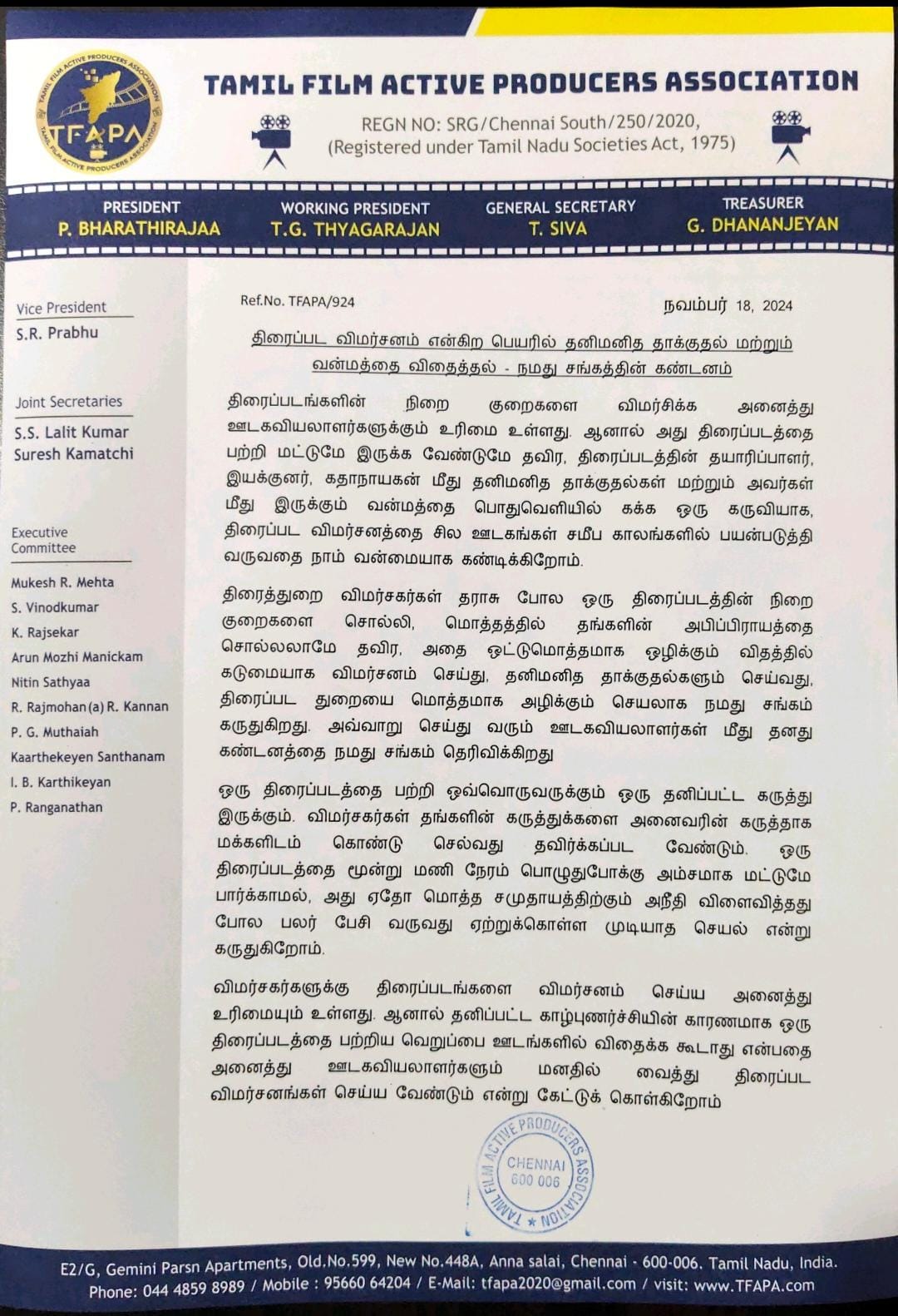 திரைப்பட விமர்சனம் என்கிற பெயரில் தனிமனித தாக்குதல் மற்றும் வன்மத்தை விதைத்தல் – TFAPA சங்கத்தின் கண்டனம்