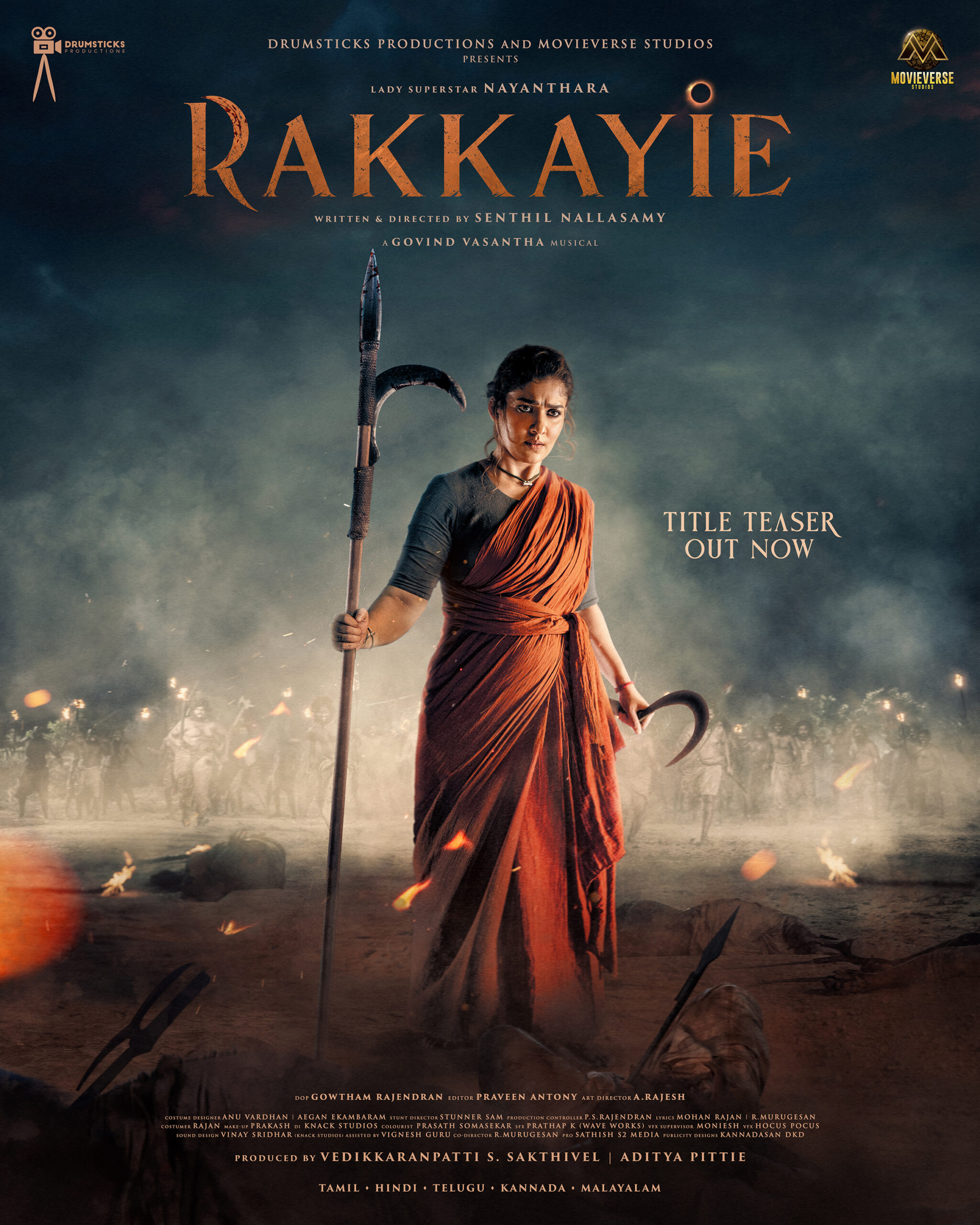 Drumsticks Productions தயாரிப்பில், லேடி சூப்பர்ஸ்டார் நயன்தாரா நடிப்பில், அறிமுக இயக்குநர் செந்தில் நல்லசாமி இயக்கத்தில், அதிரடி ஆக்சன் டிராமாவாக உருவாகவுள்ள “ராக்காயி” படத்தின் டைட்டில் லுக் டீசர், நயன்தாரா பிறந்த நாளை கொண்டாடும் விதமாக இன்று வெளியிடப்பட்டுள்ளது. Drumsticks Productions மற்றும் Movie Verse Studios நிறுவனங்கள் இணைந்து தயாரிக்கின்றனர்.