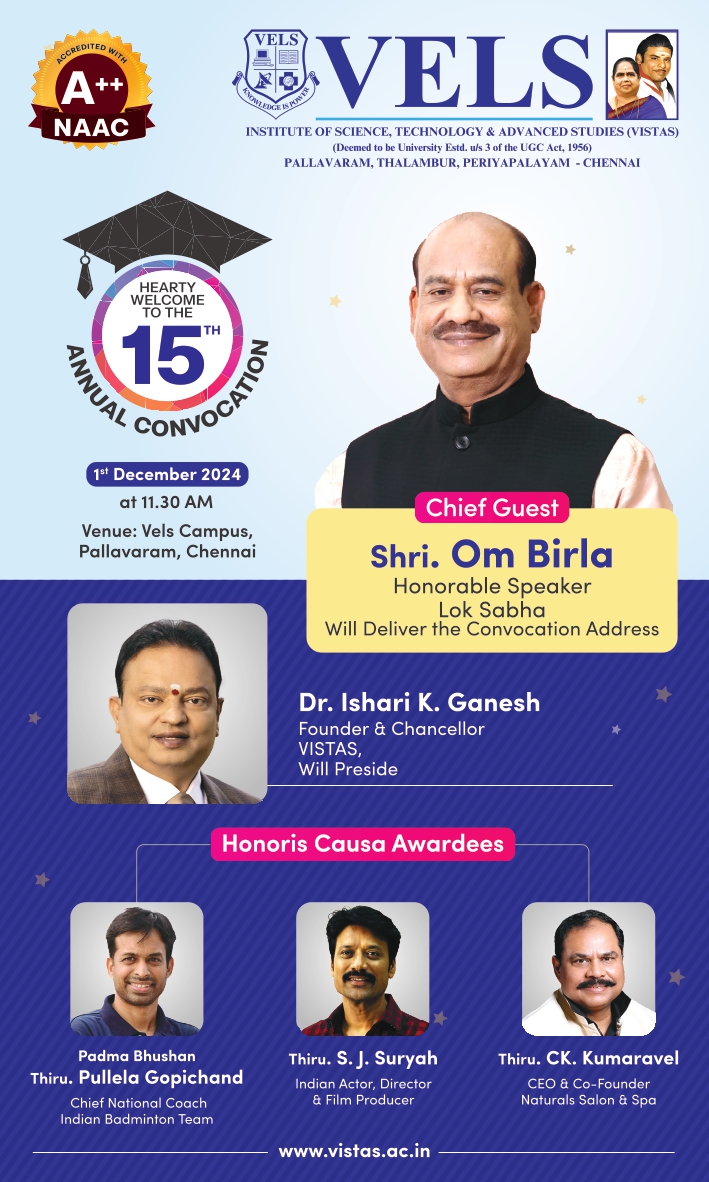 Vels University , located in Pallavaram, Chennai, is set to host its 15th convocation ceremony this Sunday at its campus. The prestigious event will be graced by the esteemed presence of Lok Sabha Speaker, Mr. Om Birla, as the special guest and Founder Chancellor Dr.Ishari.K.Ganesh will preside over the event along with the Vels group of Institutions Vice President Dr.Preetha Ganesh. During the ceremony, degrees will be awarded to 4421 undergraduate, postgraduate, and research students.