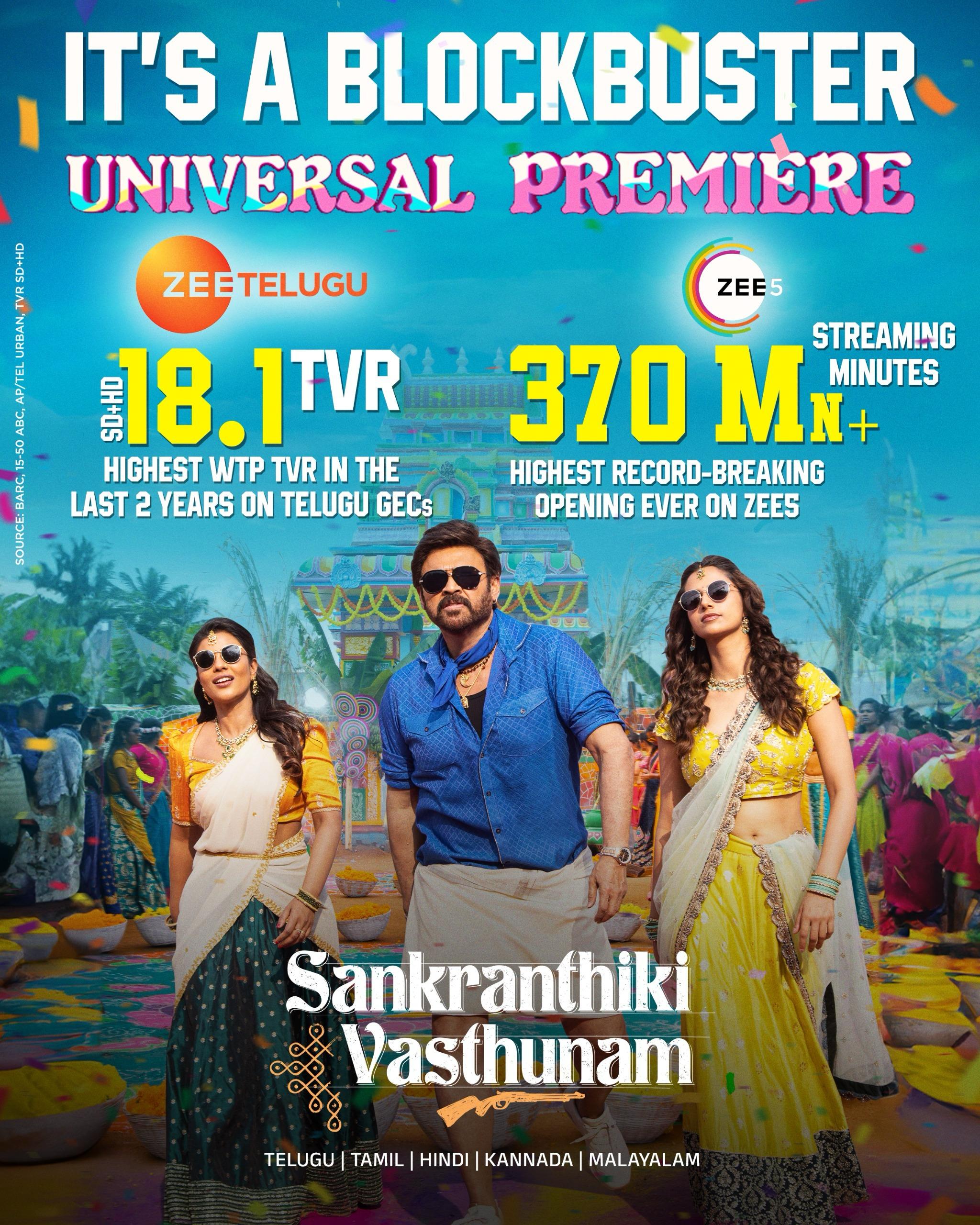 இந்தியாவின் முன்னணி வீடியோ ஸ்ட்ரீமிங் தளமான ZEE5 இல் , கடந்த மார்ச் 1ஆம் தேதி வெளியான “சங்கராந்திகி வஸ்துனம்” திரைப்படம், மிகப்பெரிய வரவேற்பைக் குவித்து, சாதனை படைத்துள்ளது. இத்திரைப்படம் 360 மில்லியன் ஸ்ட்ரீமிங் நிமிடங்களைக் கடந்து, இதுவரையிலான ஸ்ட்ரீமிங்க் சாதனைகளைத் தகர்த்துள்ளது.