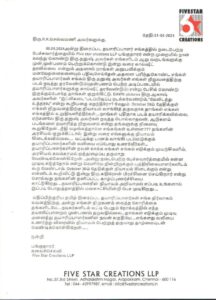 மதிப்பிற்குரிய தமிழ் திரைப்பட தயாரிப்பாளர்கள் சங்க நிர்வாகம் கவனத்திற்கு, அன்று எங்கள் நிறுவனம் வைத்த கோரிக்கை தங்களிடமே….நடிகர்களிடம் வட்டி பெறும் நோக்கத்தில் எந்த தயாரிப்பாளரும் முன்பணம் தருவதில்லை…தாங்கள் எடுக்கும் முடிவு அனைத்து தயாரிப்பாளர்களின் நலன் கருதியே….எங்களது வலியை உணர்ந்து விரைவில் நியாயம்