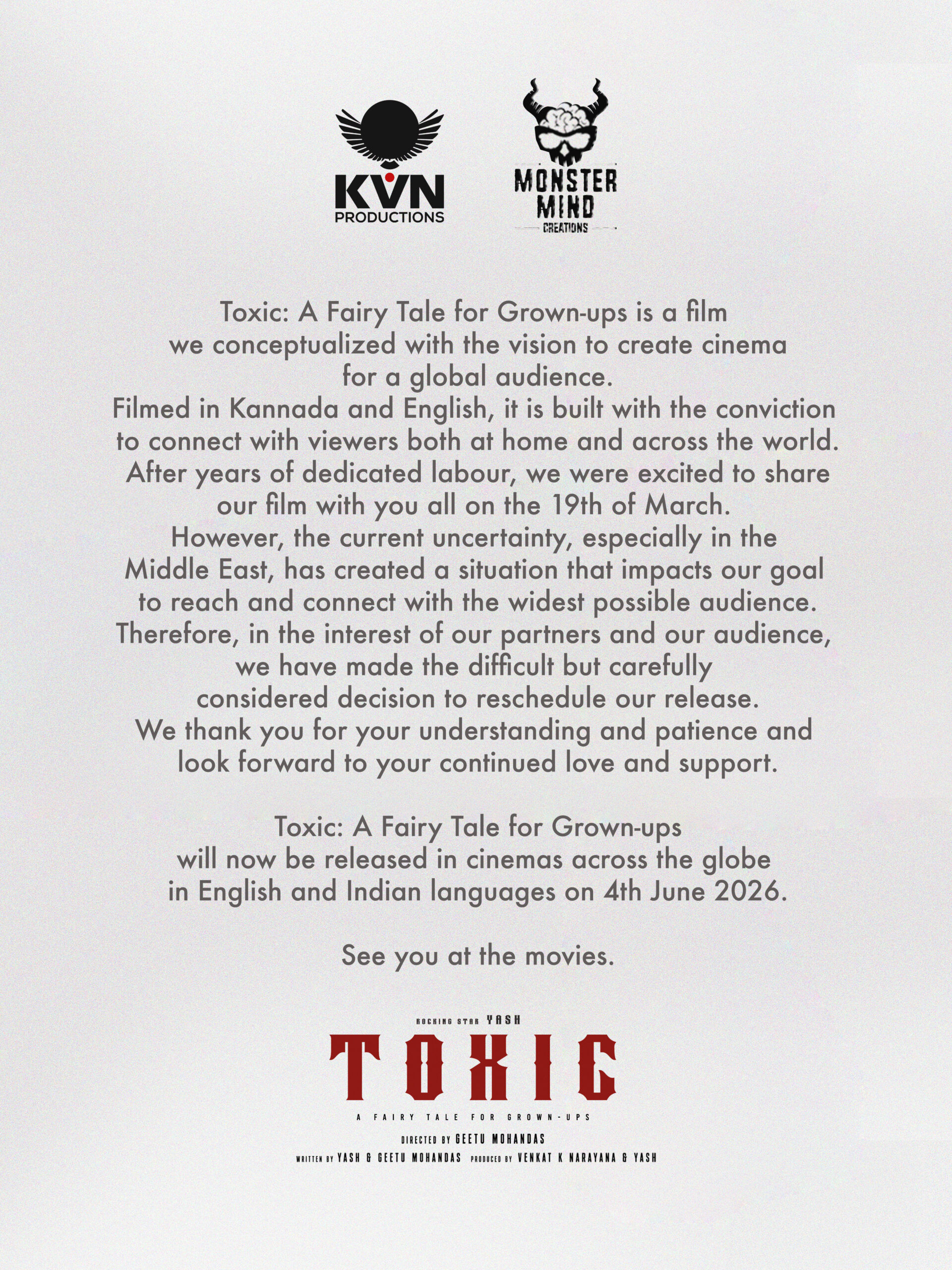 மத்திய கிழக்கில் நிலவும் அசாதாரண சூழ்நிலை காரணமாக யாஷின் ‘டாக்ஸிக்: எ ஃபேரி டேல் ஃபார் கிரோன்-அப்ஸ்’ திரைப்படம் வெளியீட்டு தேதி 4 ஜூன் 2026க்கு ஒத்திவைப்பு