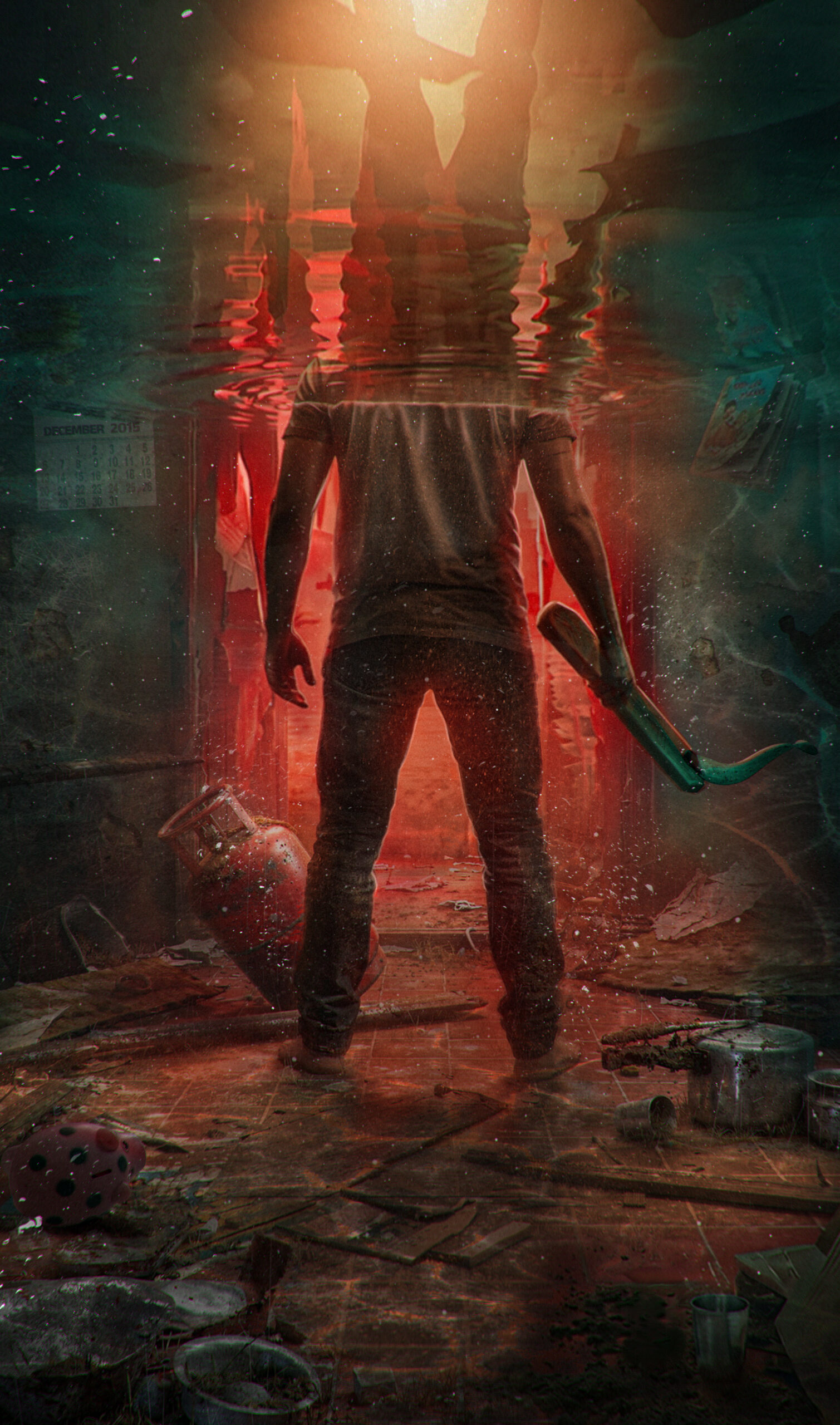 The announcement arrived with an intense, visually arresting poster. The protagonist is shown from behind, waist-deep in murky floodwater. His reflection ripples in distorted shapes, adding a surreal edge. A weapon clenched in his right-hand hints at danger and survival. Around him lies a trail of wreckage- shattered utensils, scattered debris, and an overturned gas cylinder, capturing the raw aftermath of destruction. A dim red glow pouring through a doorway ahead casts an ominous silhouette, heightening the mood of dread.
