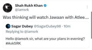 #AskSRK அமர்வில் ஒரு டிவிட்டர் பயனர் ஷாருக்கானின் அன்றைய மாலை நேரத் திட்டத்தைப் பற்றிக் கேட்டார், அதற்கு நடிகர் ஷாருக்கான், “ஜவானை இயக்குநர் அட்லீயுடன் பார்க்கலாம்” என்றிருக்கிறேன் எனப் பதிலளித்தார்.
