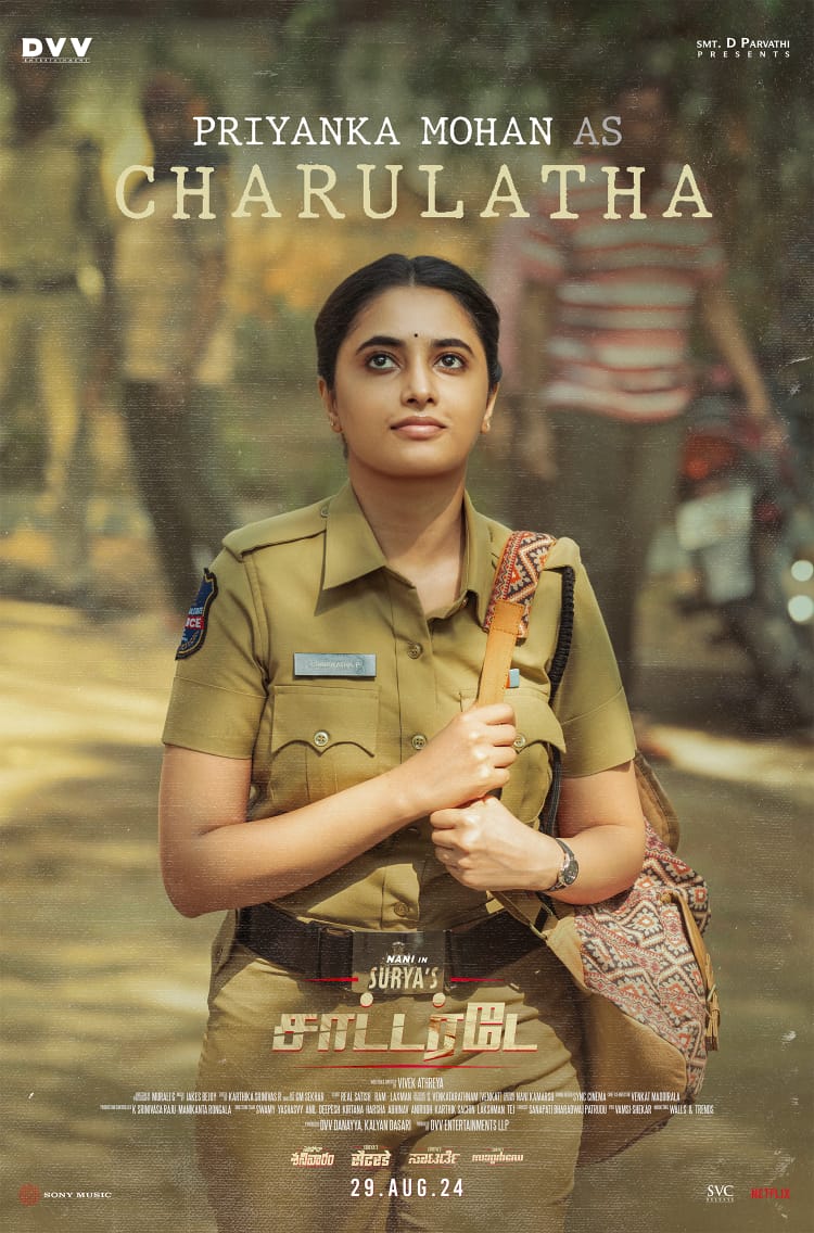 ஃபர்ஸ்ட் லுக் போஸ்டரில் பிரியங்கா மோகனின் சாருலதா கதாப்பாத்திரம், அப்பாவி போலீஸ் அதிகாரியாக காட்சியளிக்கிறது. அந்த கதாப்பாத்திரத்திற்கு மிகவும் பொருத்தமாக இருக்கிறார். அவரது முகத்தில் ஒரு அழகான புன்னகை மிளிர்கிறது. காக்கி உடையில், தோளில் பையுடன் சாலையில் நடந்து செல்கிறார் பிரியங்கா. இப்படத்தில் பிரியங்காவின் கதாபாத்திரம் மிகவும் முக்கியத்துவம் வாய்ந்ததாக இருக்கும்.