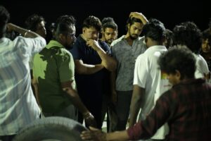During the filming of an intense stunt scene on the Ariyalur highway, a high-end luxury Benz car was dramatically wrecked under the supervision of stunt master Dinesh Subbarayan. An accident occurred unexpectedly, resulting in minor injuries to some members, including Hamsavirdhan. However, due to proper safety measures, major damage was averted.